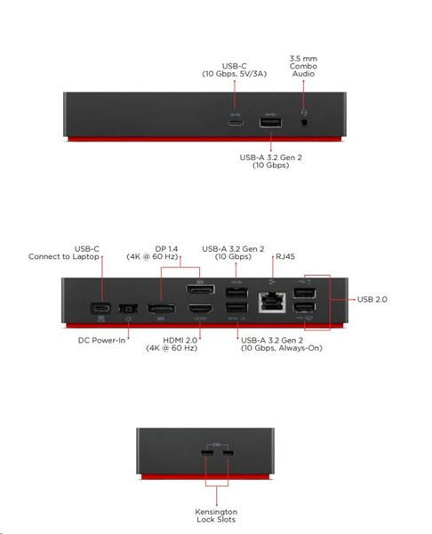 Part Number 40AY0135EU Docking Interface USB-C Docking Cable Length 1 m USB-C Cable USB Ports 2 x USB-A 2.0 3 x USB-A 3.2 Gen 2 (10 Gbps, 1 with Always-On Charging) 1 x USB-C (10 Gbps, 5V/3A) Video Ports 2 x DisplayPort 1.4 1 x HDMI 2.0 Networking 1 x Gigabit Ethernet Port Resolution Up to 3 x 4K @ 60 Hz2 Audio 1 x 3.5 mm Combo System Charging 65W with 90W Power Adapter attached; Max. 100W with 135W Power Adapter attached Security 1 x Kensington Lock Slot Warranty 3 years